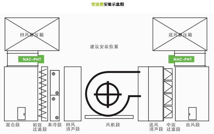 安装在集中式中央空调机组的送风总管、回风总管或者机组中间段,以达到集中净化室内空气的效果。普通的独立式空气净化设备在净化室内空气时,往往由于辐射面积有限而难以达到彻底净化室内空气的效果。NAC-PHT集中式中央空调净化装置则实现了360°全覆盖、无死角的高效净化效果。