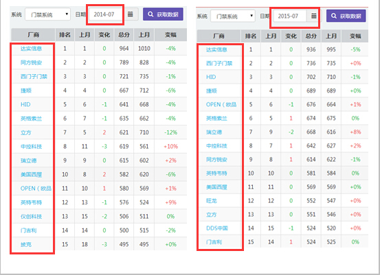 从上图门禁数据对比显示中我们不难看出,近一年的门禁系统企业们排名变化之大,其中表现最为明显的莫属“同方锐安”了,从2014年行业排名第二,下跌至2015年行业第九;可以看出在感应卡技术,生物识别技术、物联网等新技术需求给行业带来的激烈竞争。